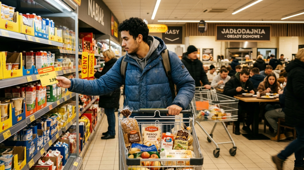 L’alimentation constitue un poste clé du budget mensuel pour un étudiant en Pologne, mais reste abordable grâce à une variété d’options. Un panier hebdomadaire type s’élève à 150 PLN (environ 379 MAD au taux de 2,53 MAD/PLN en 2026), incluant du pain à 3 PLN, du lait à 3 PLN le litre et du poulet à 20 PLN/kg dans des supermarchés discount comme Biedronka ou Lidl. Les cantines universitaires offrent des repas complets à 10-15 PLN (25-38 MAD), avec menus équilibrés adaptés aux étudiants internationaux, souvent subventionnés pour plus d’accessibilité.